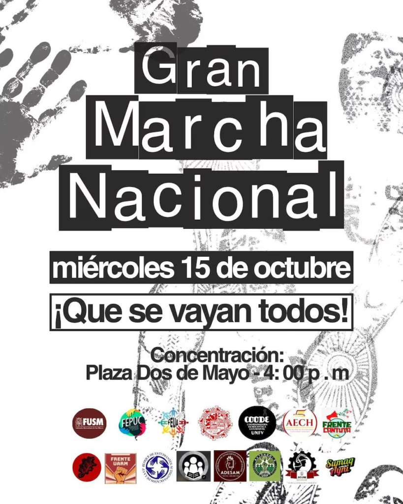 El descontento se expresó el pasado 15 de octubre con una convocatoria a la Gran Marcha Nacional anunciada por sindicatos, como la Central de Trabajadores de Perú (CGTP), agrupaciones estudiantiles, como la Federación de Estudiantes Peruanos, y cámaras de transportistas, entre otras entidades gremiales.