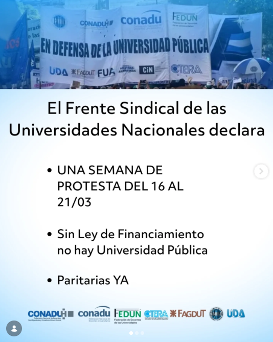 La federación docente acordó también la realización de una marcha federal para el 23 de abril a coordinar con el Frente Sindical Universitario, aunque enfatizó la importancia de la articulación entre docentes y estudiantes para “que esta nueva marcha sea la expresión masiva en las calles de un pueblo que defiende la universidad pública”.