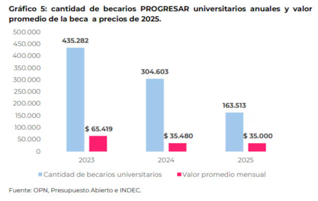 Por otro lado, el estudio del CIEN también refleja el efecto del desfinanciamiento en los estudiantes, relevando que entre 2023 y 2025 se redujo un 62,4% la cantidad de beneficiarios de las becas Progresar, mientras que el poder adquisitivo cayó 46,5%.