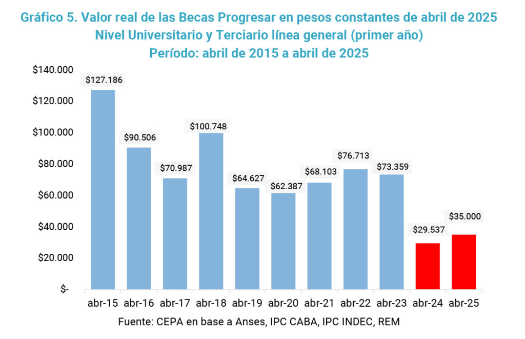 Un ejemplo del golpe al bolsillo de estudiantes se vió reflejado en la evolución de las Becas PROGRESAR fijadas actualmente en $35.000.